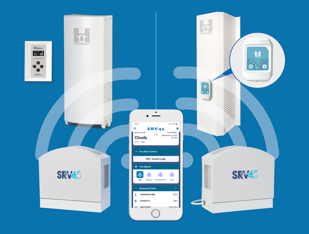 The SRV family offers versatile airflow capacities for a wide range of applications . It works seamlessly with HCS myHome for full smart ventilation control and can also be installed alongside other Humidex systems.